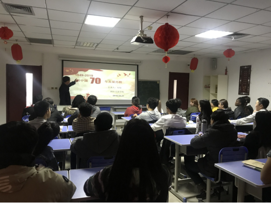 新中国70年发展历程,推动构建人类命运共同体,为人类和平与发展的崇高事业作出了巨大贡献。此次专题党课的主要内容为中国的国旗、国徽,新中国的主要领导人,中国七十年取得的伟大成就和图说改革开放取得的成就等四个部分组成。授课过程中,屈原博士以通俗易懂的语言,介绍了新中国发展历程,整堂课思路清晰,环节相扣,国际学生听的津津有味。