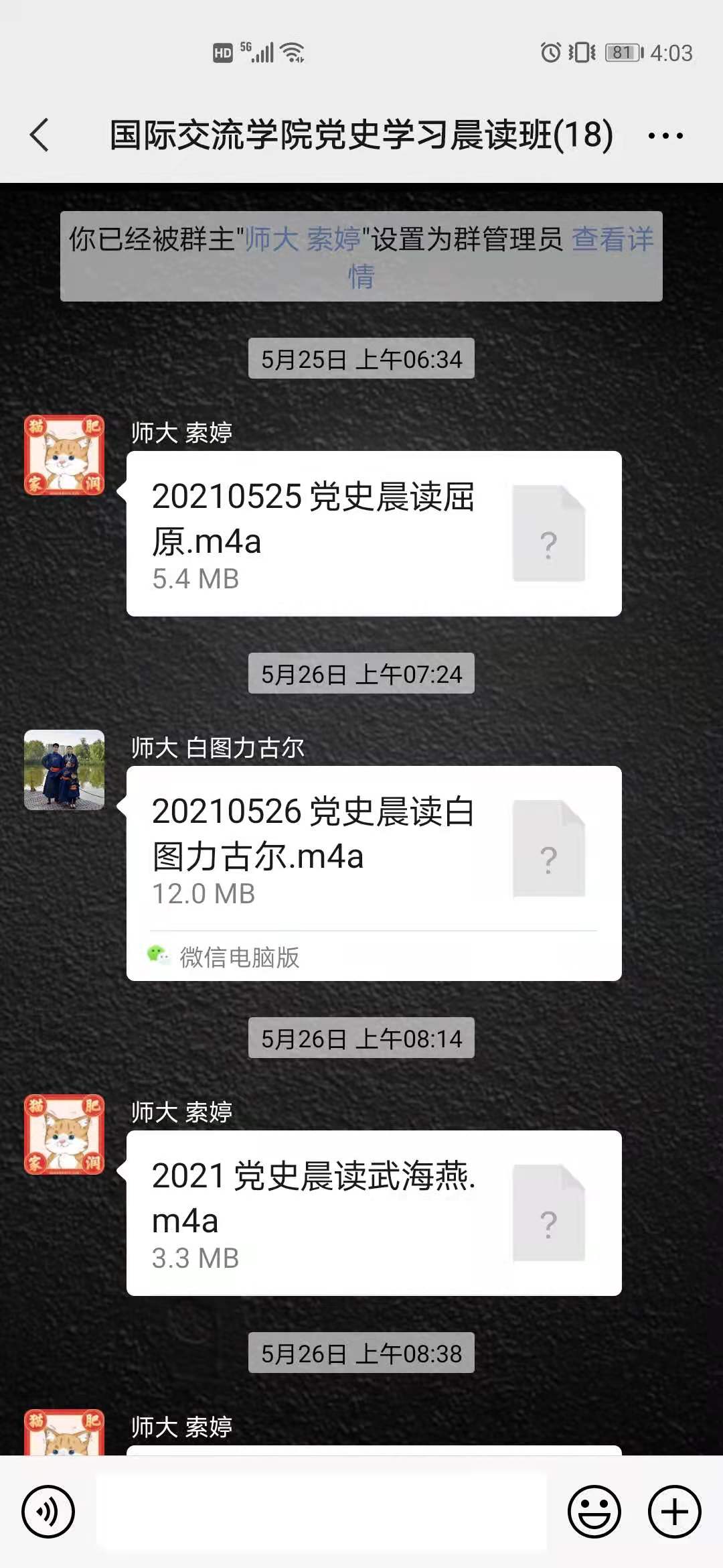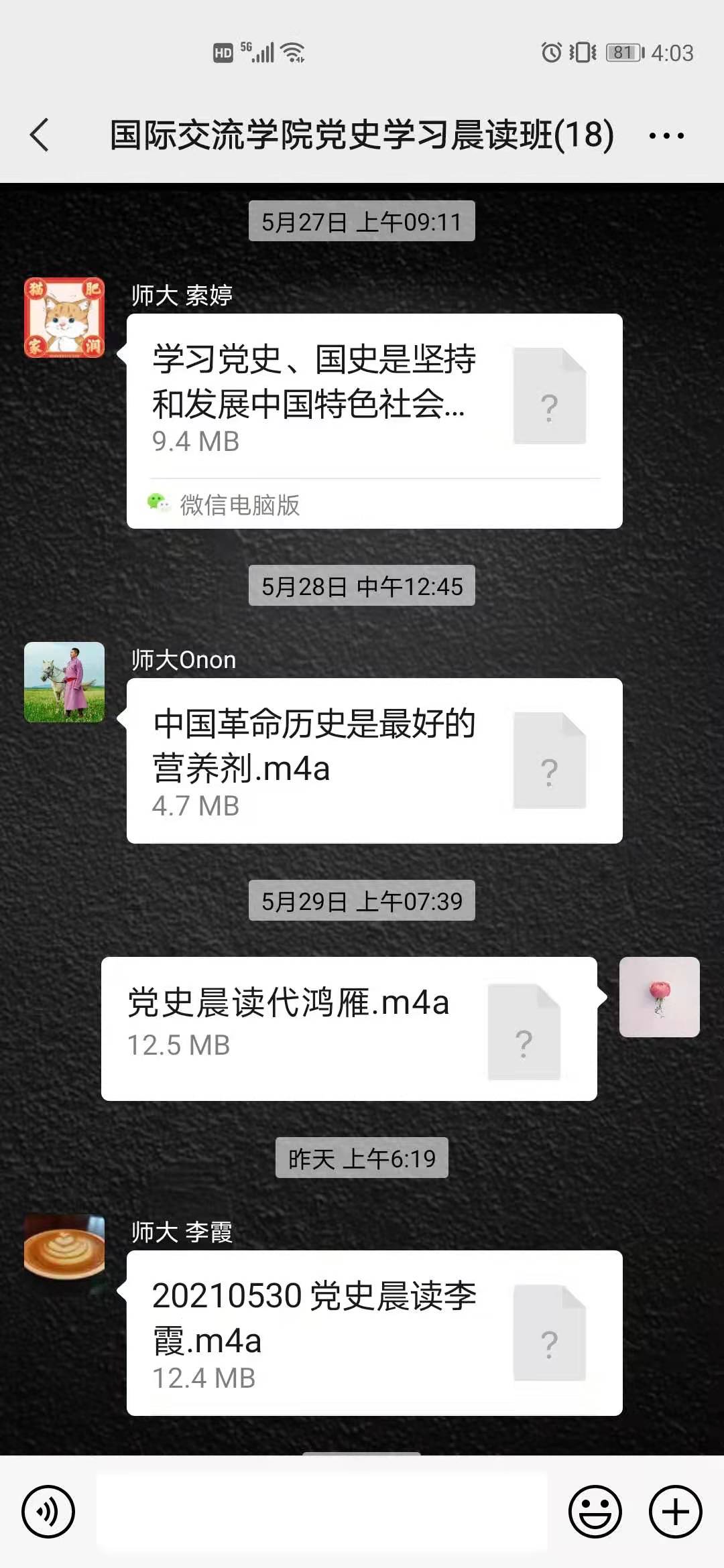 知史爱党,知史爱国。历史是最好的教科书。为扎实推动我院党史学习教育,营造“学党史、悟思想、办实事、开新局”党史学习教育的浓厚氛围,从党的百年历史中汲取奋进新征程的磅礴力量,提高党性修养,增强党员的责任感和使命感,我院从2021年5月25日以来开展了“晨读学党史,汲取前进力量”党史晨读活动。由我院领导干部和党员同志领读《习近平论中国共产党历史》、《中国共产党简史》、《习近平新时代中国特色社会主义思想学习问答》、《毛泽东 邓小平 江泽民 胡锦涛关于中国共产党历史论述摘编》等书籍。