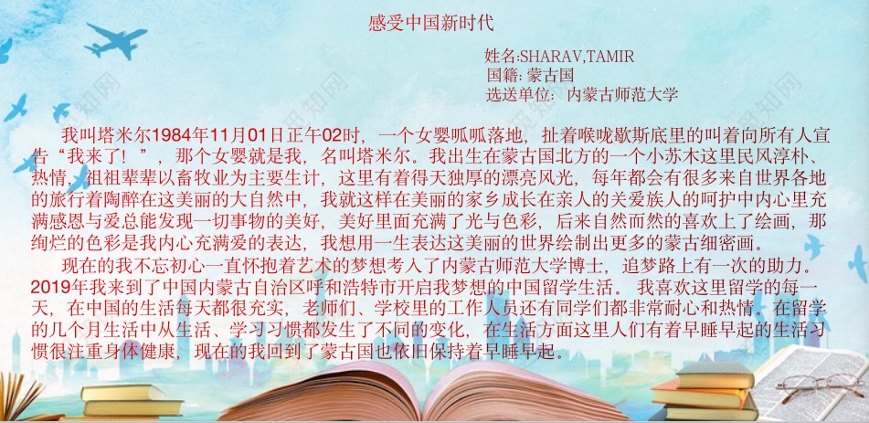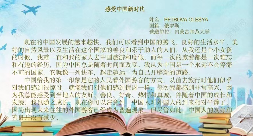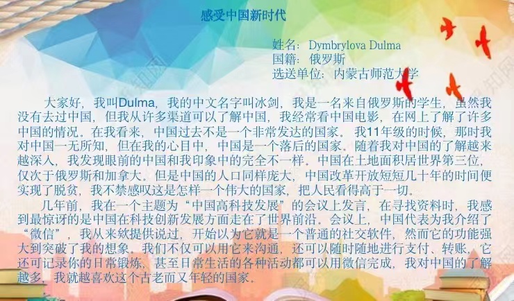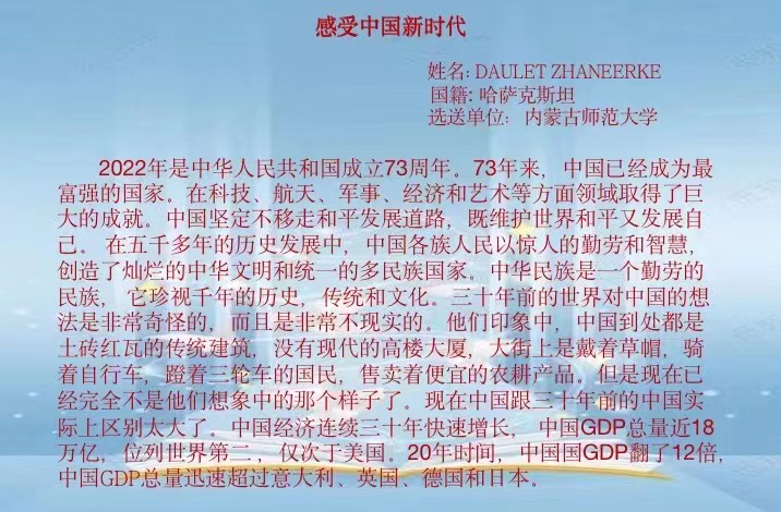在本次活动中,来自俄罗斯、蒙古国、巴基斯坦、老挝、哈萨克斯坦、泰国等六个国家的21名留学生校友报名参加。老挝校友宋夏在作文中体现了中国对教育事业的重视以及中国教学质量的提升。巴基斯坦留学生浩然在作文中说到他的留学经历和对中国、对母校的感受,也写到了中国是最安全和友好的国家,感谢学校对留学生的关心和帮助,表达了对学校的感恩之情。蒙古国校友照乐宝在作文中记录了疫情期间留学生们的亲生经历、真实感受和所思所想,为世界各国人民了解中国抗“疫”历程提供了新的视角。