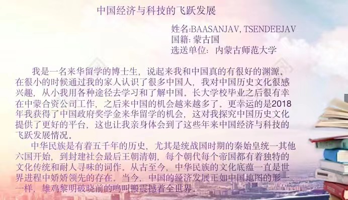 经学院评审组的评审,最后蒙古国留学生岑德扎布荣获一等奖,俄罗斯留学生林一然、哈萨克斯坦留学生加尼乐克荣获二等奖,俄罗斯留学生冰剑、老挝留学生宋夏和蒙古国留学生塔米尔获得三等奖。