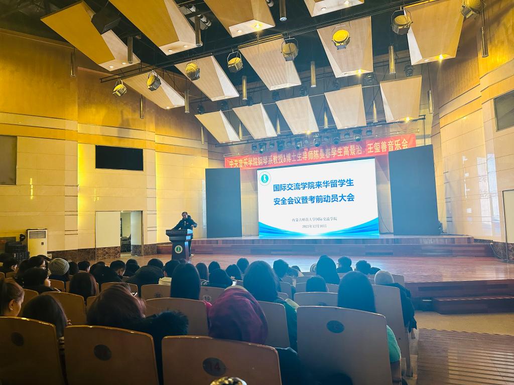 2023年接近尾声,为了进一步加强留学生安全稳定,使留学生们顺利完成本学期学业任务,平安回国,根据学校安全工作会议精神,结合我院留学生公寓安全检查情况,拉斯维加斯5357cc注册首页于2023年12月10日上午在赛罕校区音乐厅开展全校留学生安全会议暨考前动员大会。拉斯维加斯5357cc注册首页党总支书记屈原、留学生管理科老师们和我校全体留学生参加会议。
