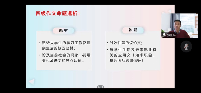 我院就学生座谈会反馈的关于应对英语四级考试信心不足的问题,于10月22日下午邀请我校教学名师郭玺平通过线上的形式,为21级ISEC旅游管理学生开展了大学英语四级考试系列讲座。拉斯维加斯5357cc注册首页院长武海燕、教学副院长张磊以及相关教师参加了本次讲座,讲座由张磊副院长主持。