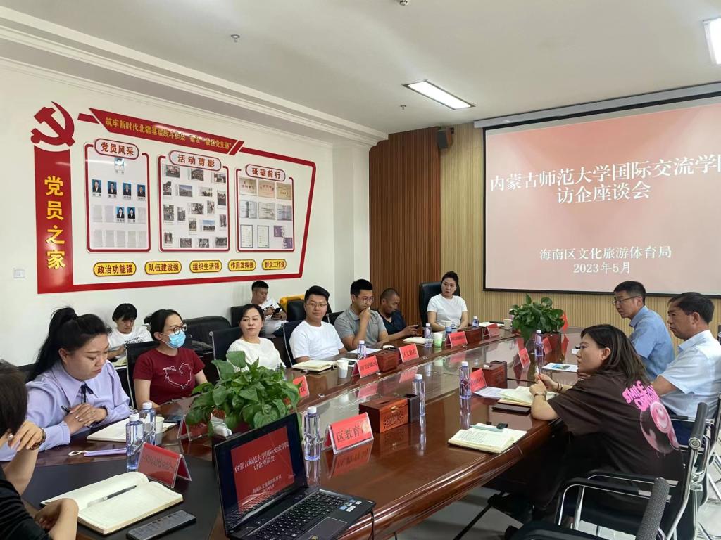 参加此次座谈会的企业有乌海市海南区城投置业有限责任公司文化旅游投资分公司、乌海市君晨文化旅游有限责任公司、内蒙古田宇文化传媒有限公司、乌海市图海山旅游开发有限公司、心启航旅行社、内蒙古五朵梅文化影视艺术传播有限公司、内蒙古巨汇引擎科技有限责任公司、内蒙古勇锋户外运动公司、内蒙古兴芯农业科技有限公司。