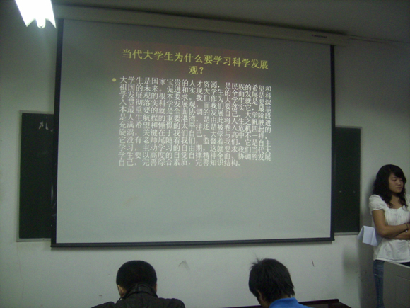 在活动中,学生代表们踊跃发言,阐述了科学发展观的内涵和具体内容,以及这一理论对当代大学生的要求和指导意义。通过对科学发展观的学习,同学们更加深刻的认识了科学发展观及其对当代大学生的指导意义,进一步明确了当今社会发展的方向和对人才的要求,认识到了当代大学生努力和发展的目标,增强了对自身和社会的使命感。