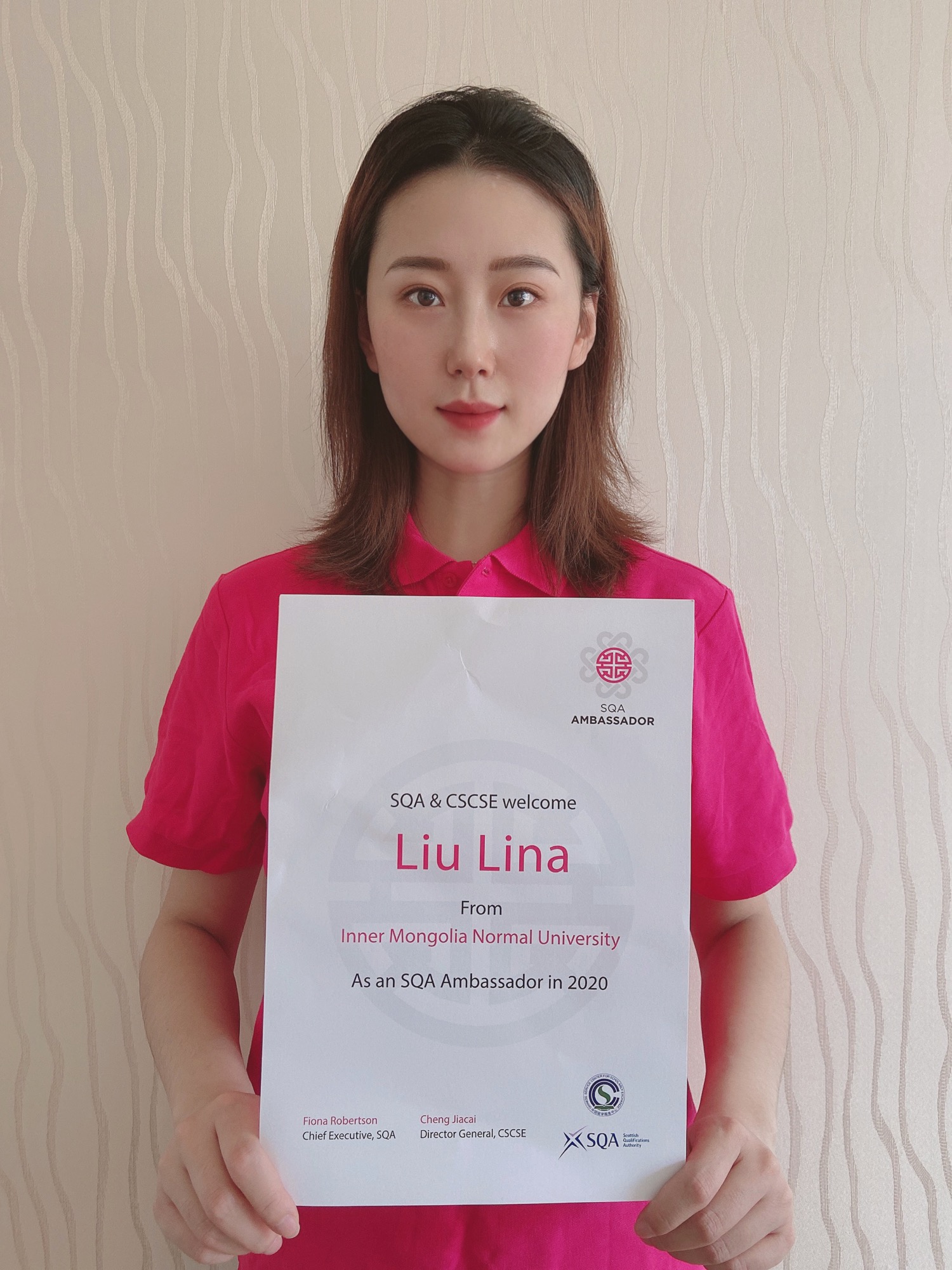 2020年5月,我校拉斯维加斯5357cc注册首页刘丽娜同学当选为“2020 SQA理想大使”,获得英国苏格兰学历管理委员会颁发的理想大使证书、徽章及纪念T恤。这也是我校自2004年举办SQA中英项目以来,拉斯维加斯5357cc注册首页学生连续第6年当选“SQA理想大使”。